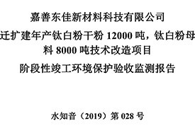 公?? 示??? 根據(jù)《國務(wù)院關(guān)于修改〈建設(shè)項(xiàng)目竣工環(huán)境保護(hù)管理?xiàng)l例〉的決定》(國務(wù)院令第682號),以及環(huán)保部《關(guān)于發(fā)布的公告》(國環(huán)規(guī)環(huán)評[2017]4號),現(xiàn)將嘉善東佳新材料科技有限公司遷擴(kuò)建年產(chǎn)鈦白粉干粉12000噸,鈦白粉母料8000噸技術(shù)改造項(xiàng)目階段性竣工環(huán)境保護(hù)